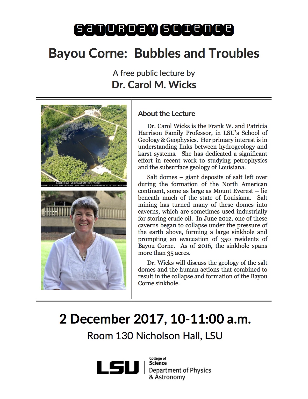 | December 2, 2017 | "Bayou Corne: Bubbles and Trouble" | Carol Wicks, Geology & Geophysics |