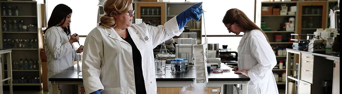 Dr. Jackie Stephens working in her lab with two students.